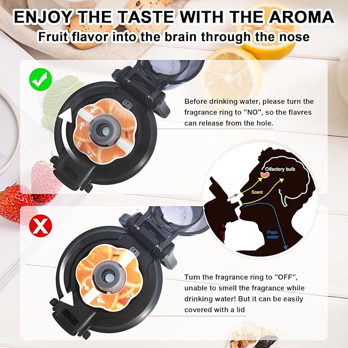 - 【How It Works】Scent air water bottle with fruit lidsules unlike ordinary water bottles, our innovative design delivers natural fruit essences directly to your brain through your nose, so you can experience the delightful aroma of fruits while hydrating. With 0 sugar and 0 calories, it's the perfect choice for a healthier lifestyle for you and your families.