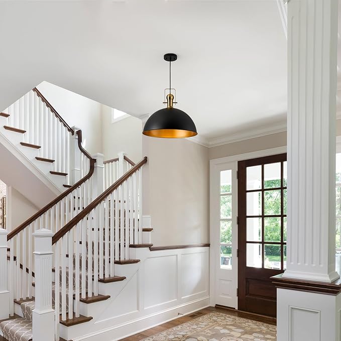 - [Industrial & Vintage Design]: 3-Light industrial farmhouse pendant light fixtures with adjustable cord, mattle black finish featuring retro-style dome shade, this antique pendant lighting is made of sturdy metal construction in black finish and inner gold finish.The vintage pendant lights is ideal for home, dining room, kitchen island, warehouse, entryway, corridor, restaurant, cafe, bar, club, barn, working bench.