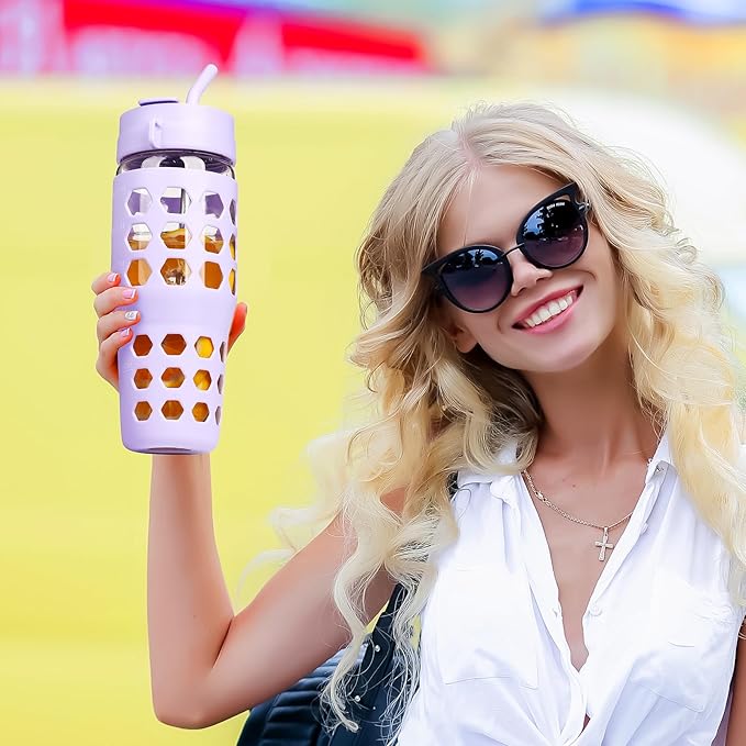 MUKOKO 32 oz Glass Tumbler with Straw,Glass Water Bottles with Time Marker,Iced Coffee Cup with 2 Lids-Handle Spout Lid&Straw Lid,Silicone Sleeve,Leakproof,1 Pack-Purple
