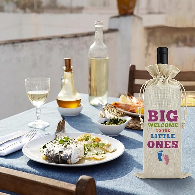 - New Baby Announcement Gift: This wine bags are double-sided printed which printed the text--"BIG WELCOME TO THE LITTLE ONES"and can catch other's attention quickly. Sharing your happiness with your friends, mom, besties, sister, best friends. They will be happy for you when they see this gift.