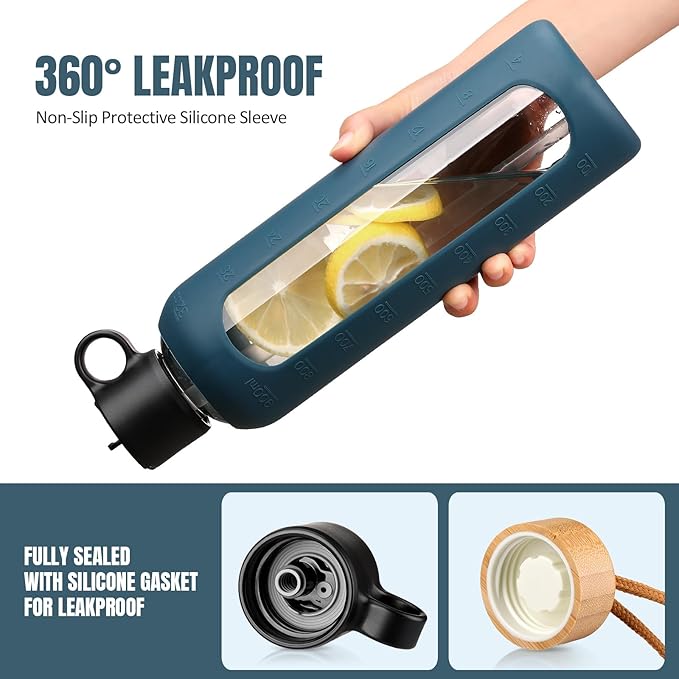 32oz Glass Water Bottle With 2 Lids-Flip Straw Lid, Bamboo Lid, Glass Water Bottle With Silicone Sleeve, Motivational Time Marker, Glass Juice Bottle for Cold Drink,Navy Blue