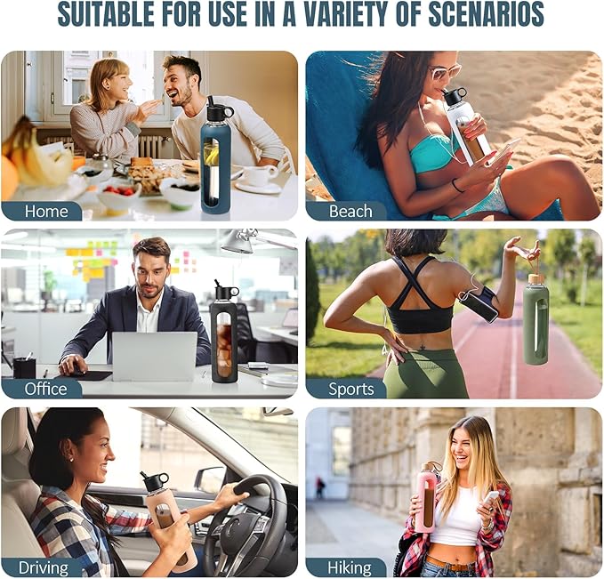 - MULTIPLE OCCASIONS -WINSA glass water bottle with straw is ideal for both daily inhouse or outdoor occasion, such as Home, work office, sports, gym, beach, hiking, camping or driving. Great present option for friends or families on School, Thanksgiving, Xmas, Birthday, Anniversary, etc. Our glass water bottle come with both 24oz and 32oz, each with 8 trendy colors and all have interchangeable 2 lids making this your ultimate drinking companion!