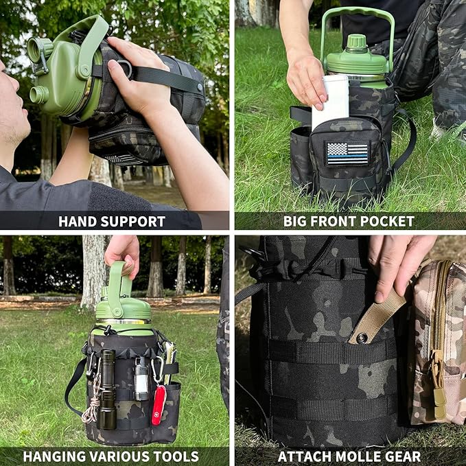 - 【Tactical Bag For Easy Carring】:Our water bottle holder is made of double-layer polyester and insulating Oxford cloth, which provides protection for the water jug. The water bottle bag also adds warmth, making it more effective in maintaining cold or hot. It has a detachable shoulder strap for carrying and a hand support strap on the side for easy pouring of water. Water bottle carrier bag has MOLLE webbing attachments and a large storage compartments for your phone, keys, wallet and more.