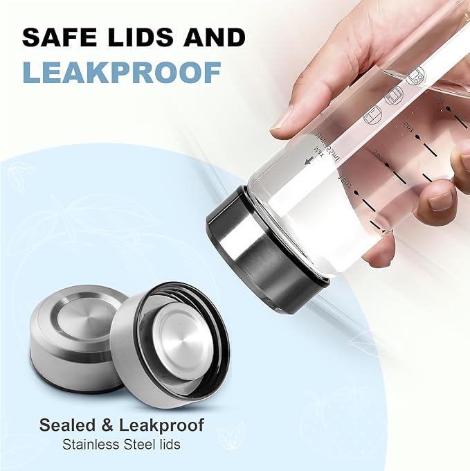 - [DURABLE LEAD-FREE GLASS & BPA FREE] Made of quality food grade eco-friendly high borosilicate glass, our glass water bottle will never leach chemicals, absorb odors or stain.It is healthy and safe during use for hot & cold drinks,prepare chilled beverages likes juices, smoothies, infused waters, nut milks, iced coffees,kombucha and iced tea.