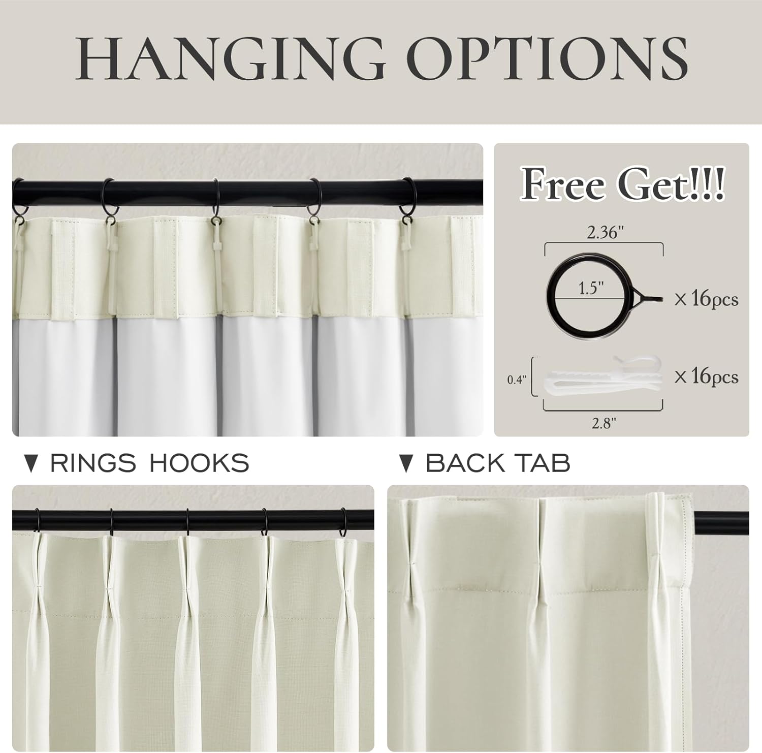 - Multiple Hanging Ways:3 hanging options to meet different home decor.1:Hanging with hooks on rings or track to easy slide (hooks,rings are included).2:Using back tab to hide the rod,easy to hang and hide the rod.3:Using clip rings(clip are not included)