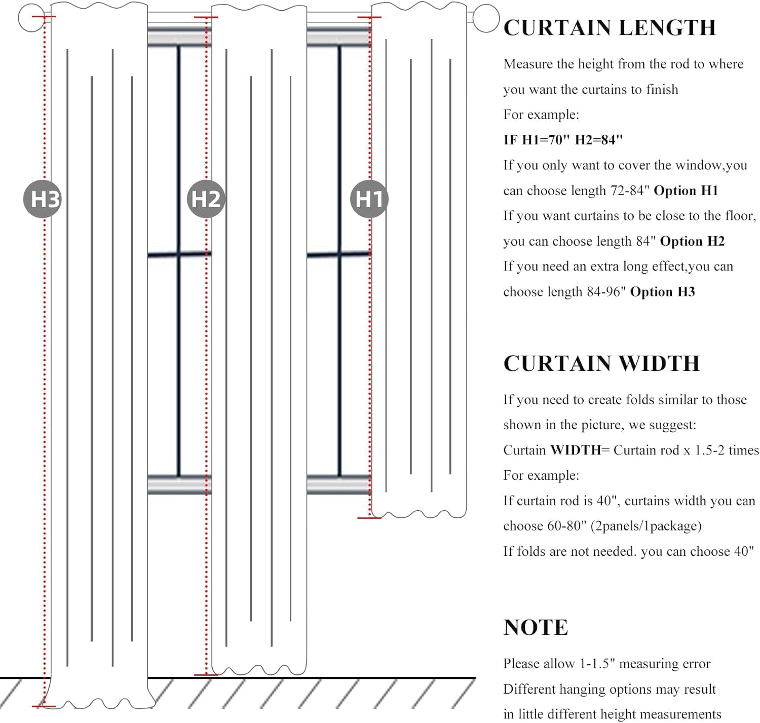 - Ready Made:Set of 2 pinch pleated curtain panels per package with 16 metal rings and 16 adjustable plastic hooks(The adjustable hook can raise and lower the height of the curtain by 1 inch),Each panel measures 40"W x 120"L,pair measures 80"W x 120"L