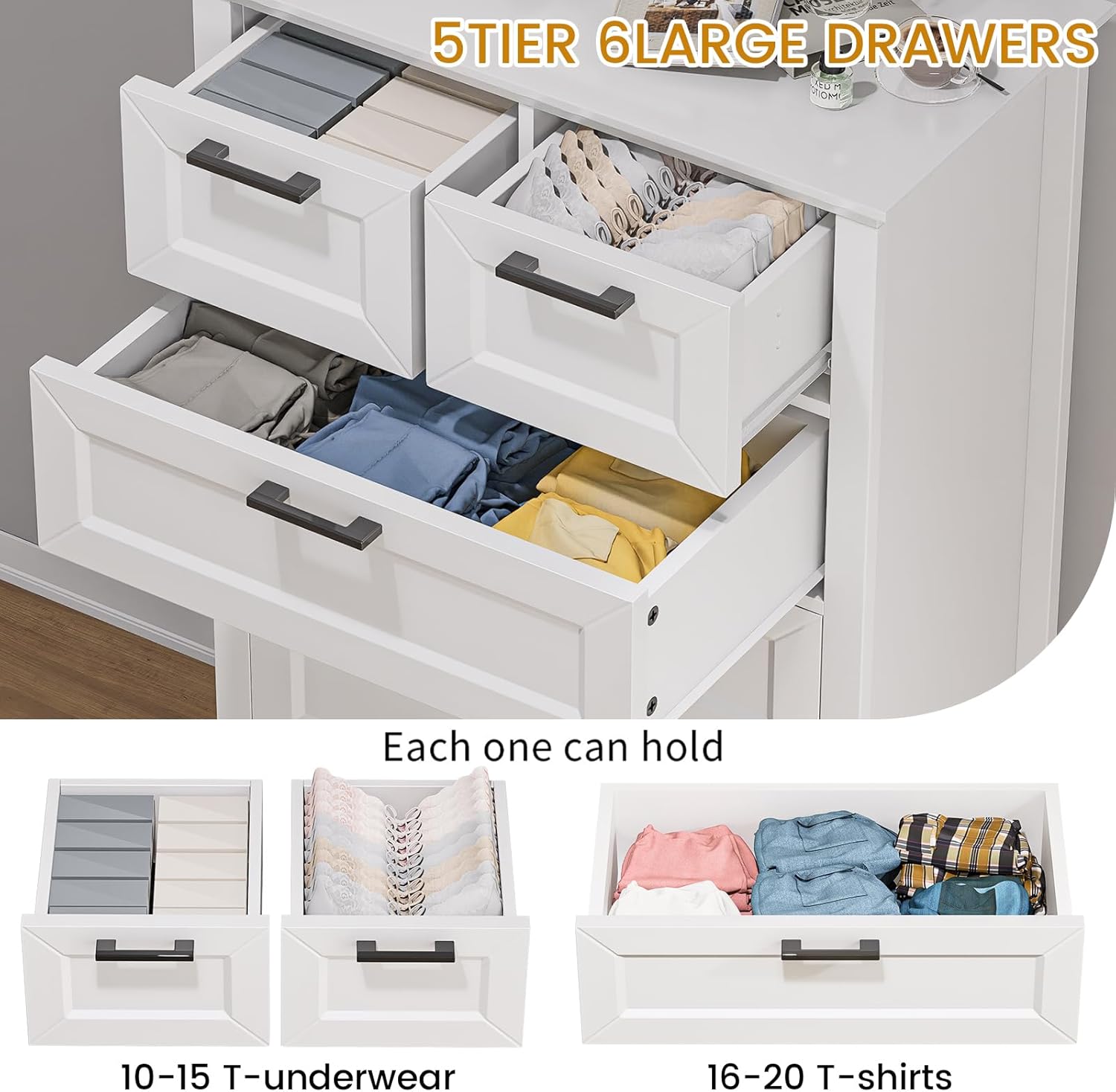 Odeekea White Dresser with 6 Drawers, Vertical Tall Dresser for Bedroom, Chest of Drawers for Nursery, Wood Closet Drawers for Hallway, Living Room, Entryway, 47” Tall Modern Farmhouse Style