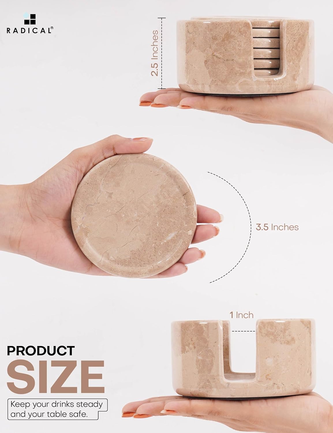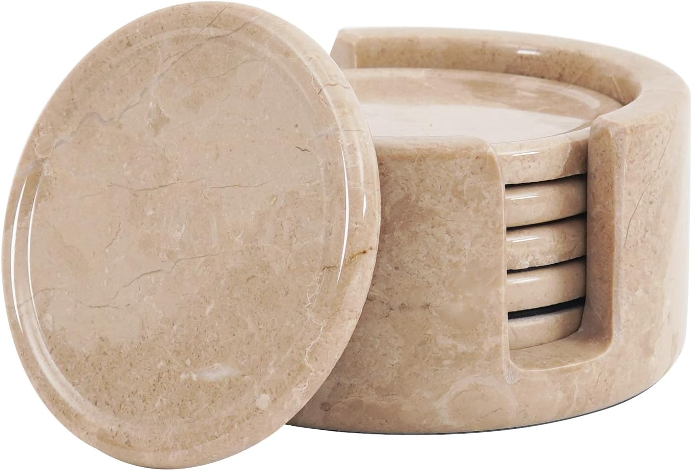 - Set of 6 with Holder Included - Includes 6 round stone coasters with a matching holder for easy storage and display.