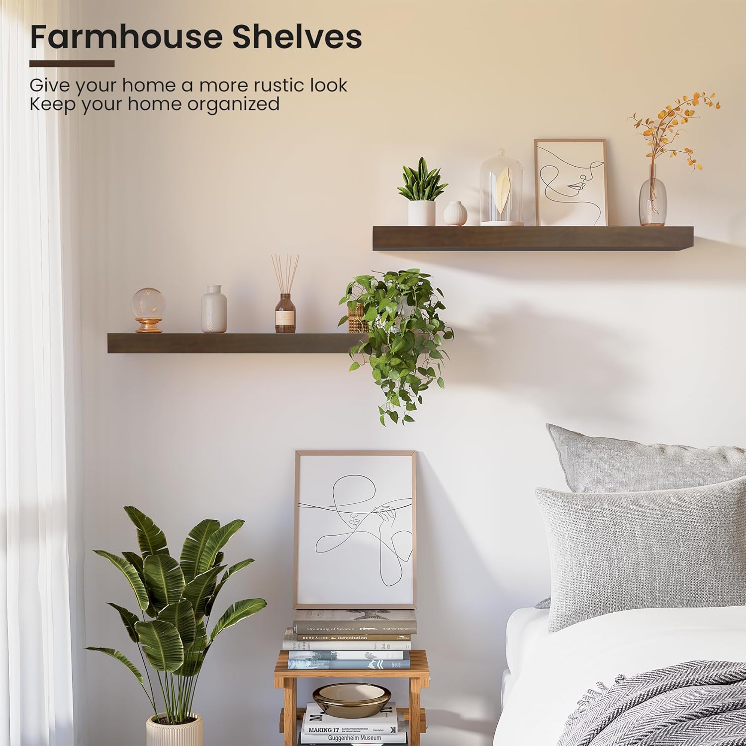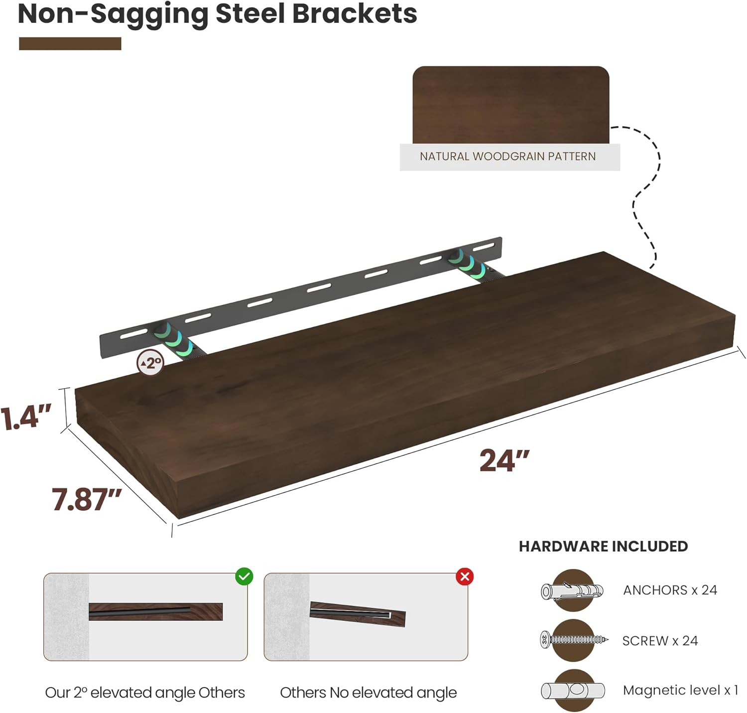 Wood Floating Shelves for Wall 24” x 8”x 1.4” Shelf Floating Rustic Farmhouse Decor, Heavy Duty Shelf Hold 60 lbs, Wall Shelves for Bathroom Living Room Kitchen Bedroom Office, 2 Packs Walnut