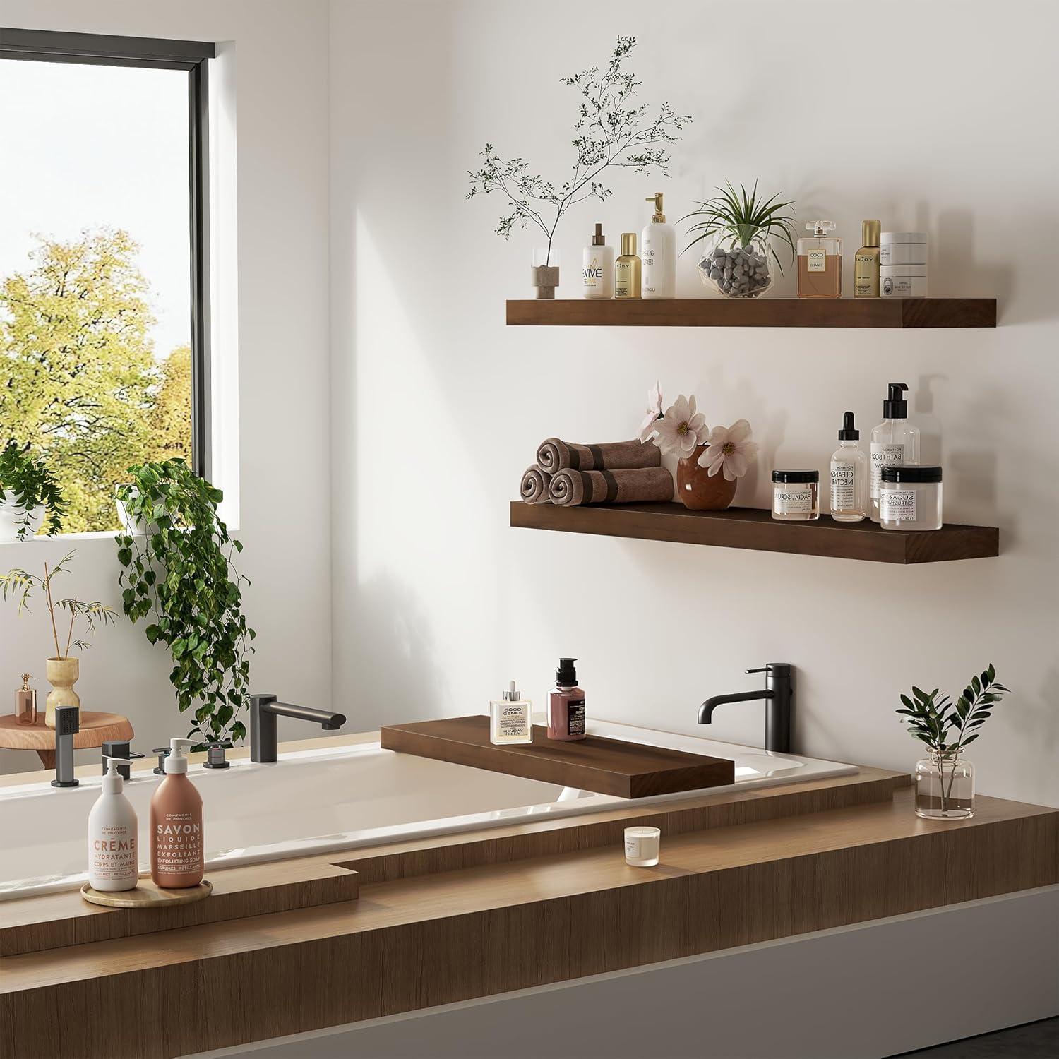 - Natural Wood & Wall Mounted Design - Slight color differences may occur due to lighting and screen settings.Our bathroom floating shelves for wall are made of wood which grows naturally, so each piece of the board has unique natural wood grain and color. Through the simplest charcoal roasting process, we restore the carbonized color and texture of the wood itself. It highly recommend them for anyone looking to add functional and stylish storage to their bathroom space.