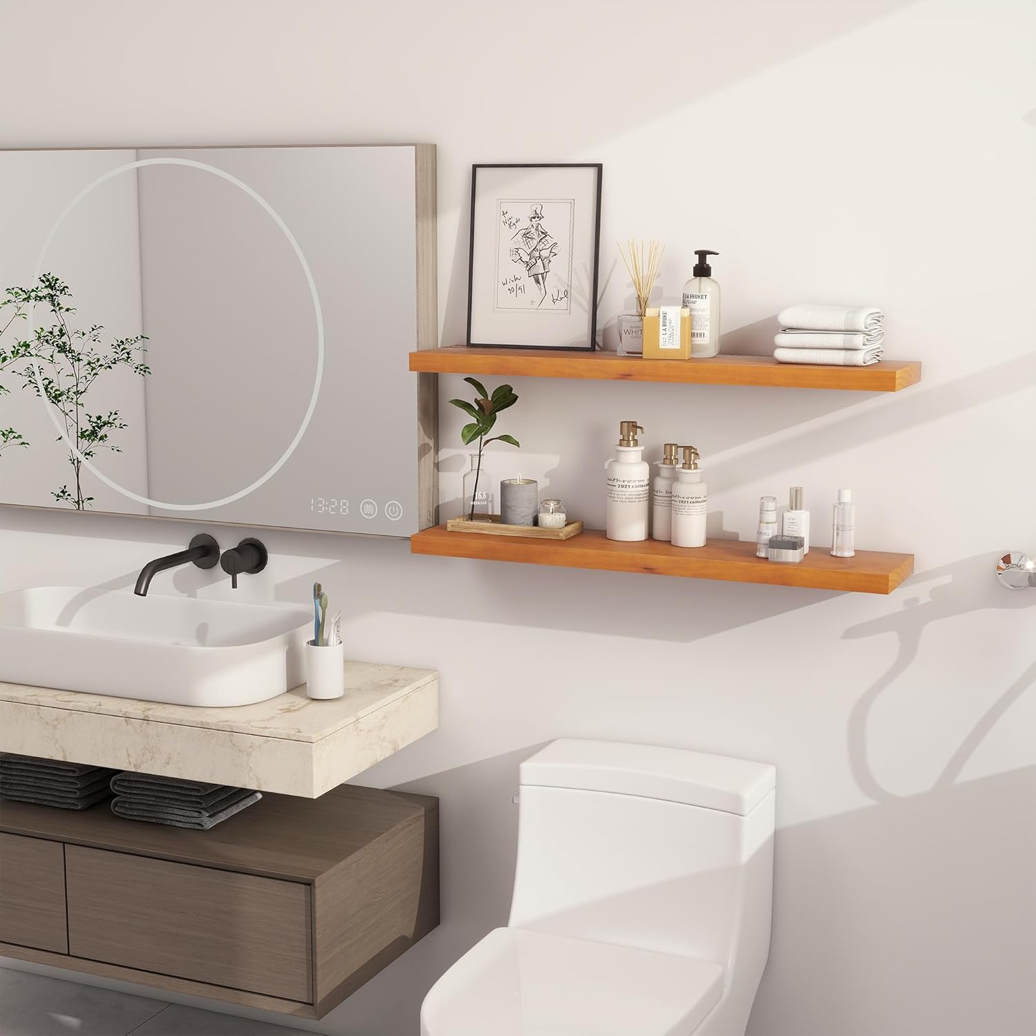 - Natural Wood & Wall Mounted Design - Slight color differences may occur due to lighting and screen settings.Our bathroom floating shelves for wall are made of wood which grows naturally, so each piece of the board has unique natural wood grain and color. Through the simplest charcoal roasting process, we restore the carbonized color and texture of the wood itself. It highly recommend them for anyone looking to add functional and stylish storage to their bathroom space.