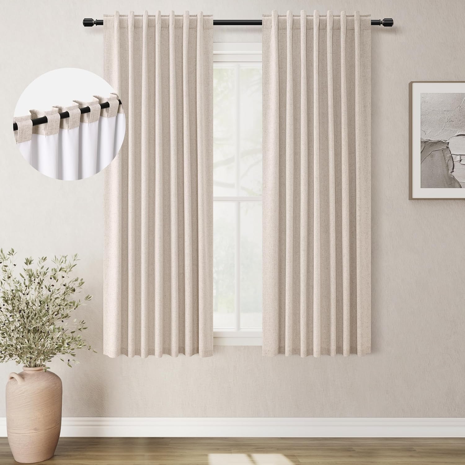 - 3 Hanging Options: Differ from the traditional curtains with grommet, BOODII linen curtains with back tab and rod pocket can full block sunlight fully. (1) Using the back tabs design to create an elegant pleated look and sit closer to the wall than traditional ring curtains, which helps to block out more sunlight; (2) Using rod pocket for a classic effect; (3) Using clip rings on track system or curtain rod, slide open/closed easily (clip rings are not included).