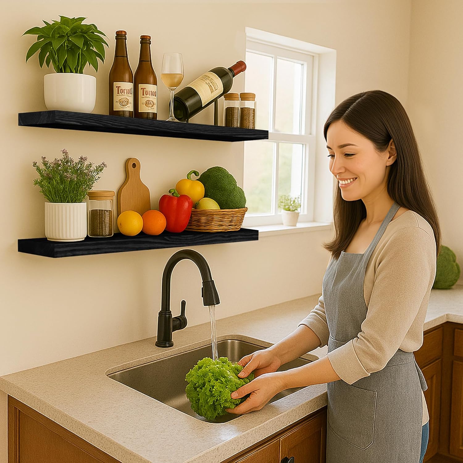 BGMG Wood Floating Shelves 36 inch Long,Wide Rustic Wooden Wall Shelves for Bathroom Living Room Bedroom Kitchen Farmhouse Set of 2-36x6.7x1.25 inch-Black
