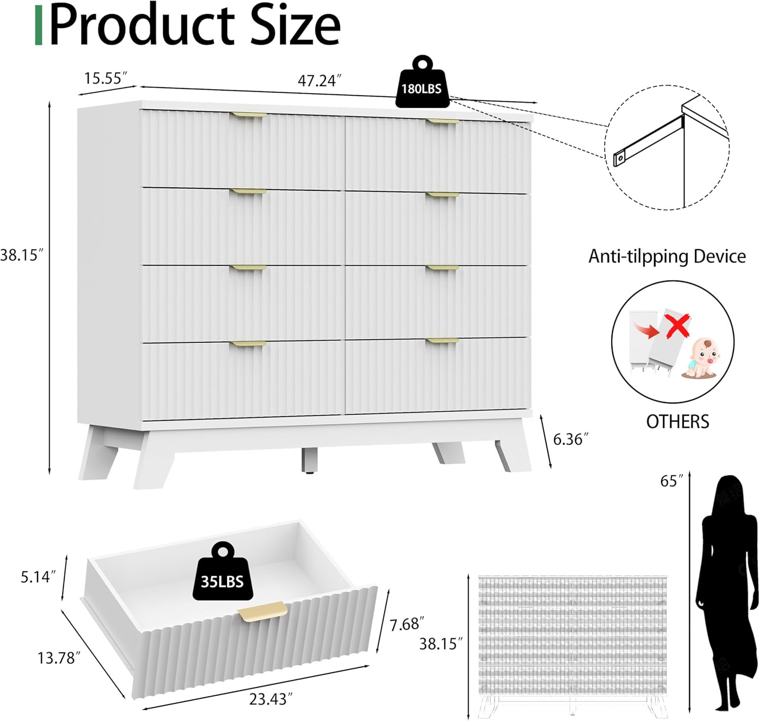 - 【Stability & Safety】The white/black/natural oak dresser is equipped with an anti-tipping device, which can be fixed on the wall to prevent accidents. Each drawer contains a wide metal handle and built-in slide rail, easy to push and pull. Besides, the sturdy base provides this dresser with drawers a strong support and the middle feet can be adjustable to keep balance on uneven floors