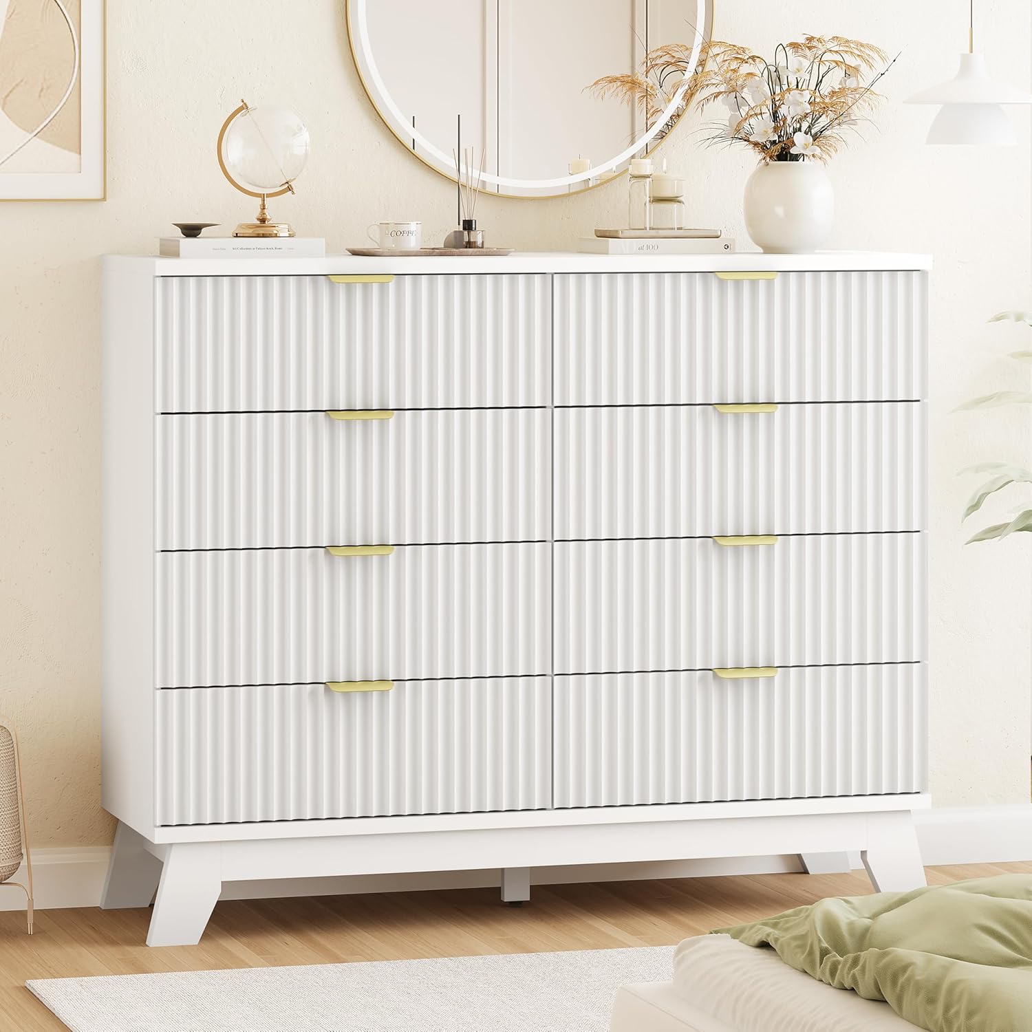 Fluted Dresser for Bedroom with 8 Drawers, 48" Wide Modern Chest of Drawers with Metal Handle, Wooden Dresser TV Stand, Wood Closet Clothes Storage Drawer Organizer for Living Room, Hallway, White