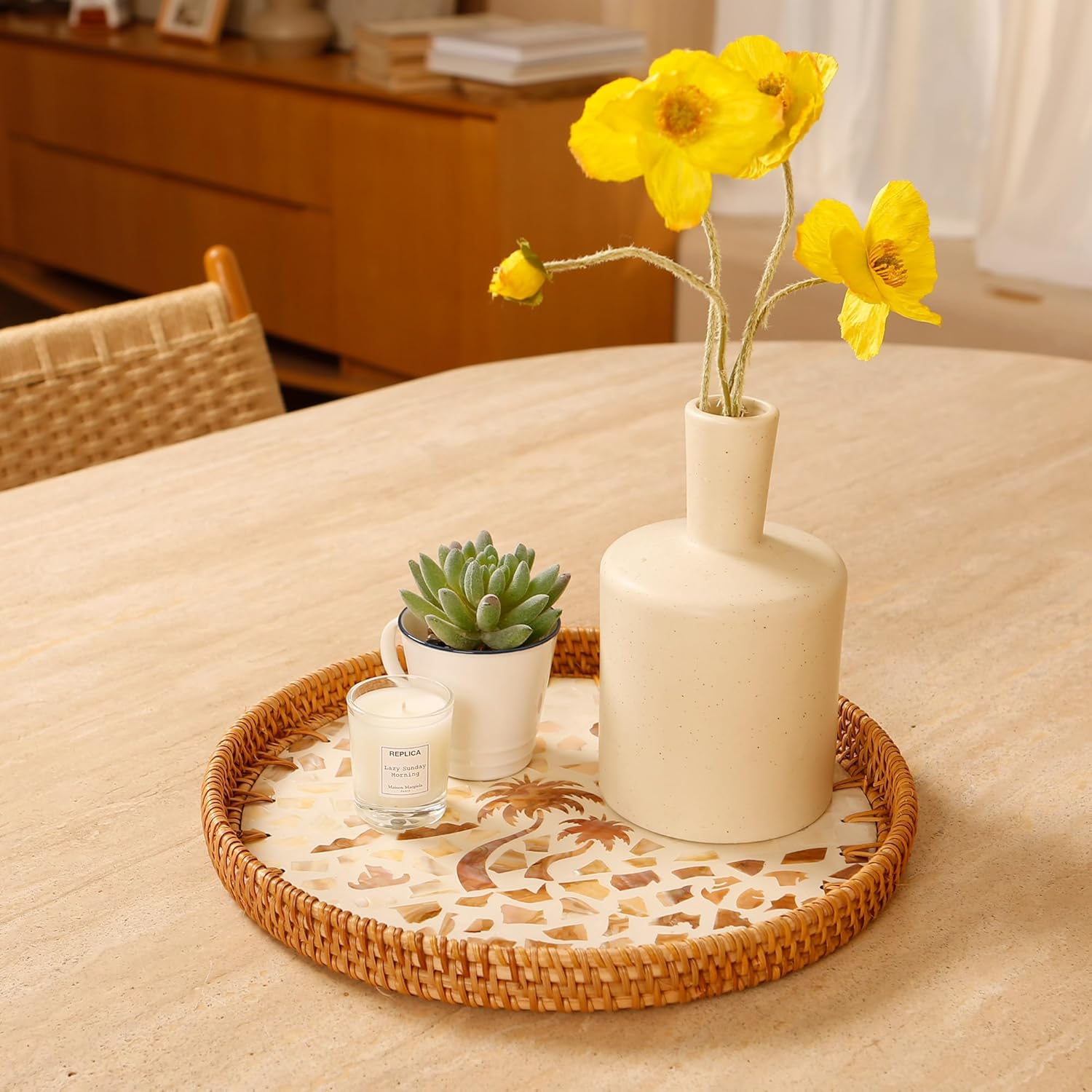 - Handwoven with Care: Each tray is carefully woven by skilled artisans, natural rattan texture and the subtle shine of seashells, reflecting a high level of craftsmanship and attention to detail