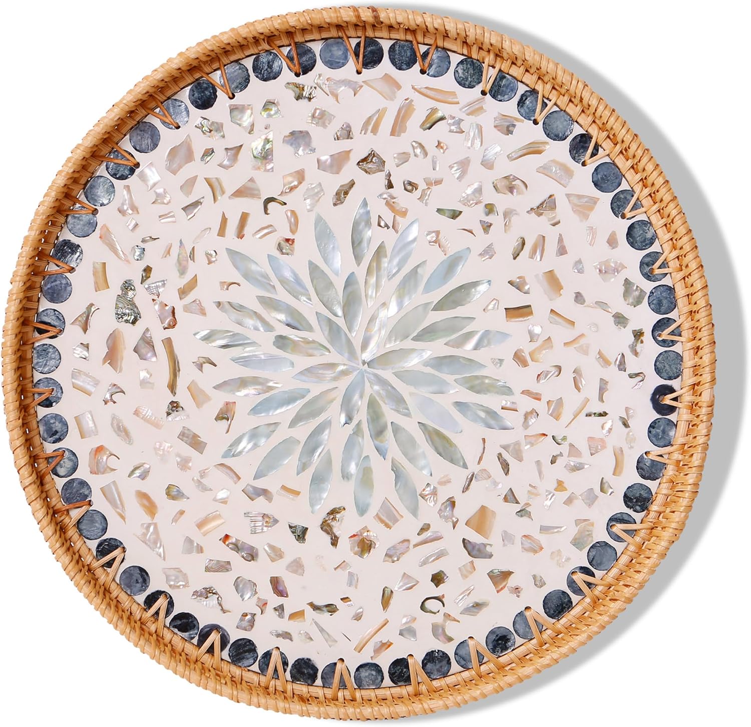 Round Rattan Tray with Mother of Pearl Inlay & Wooden Base - Decorative Wicker Serving Tray for Coffee/Bread/Fruits, Food Storage & Display - Multipurpose Home Decor (L,Blue Shells)