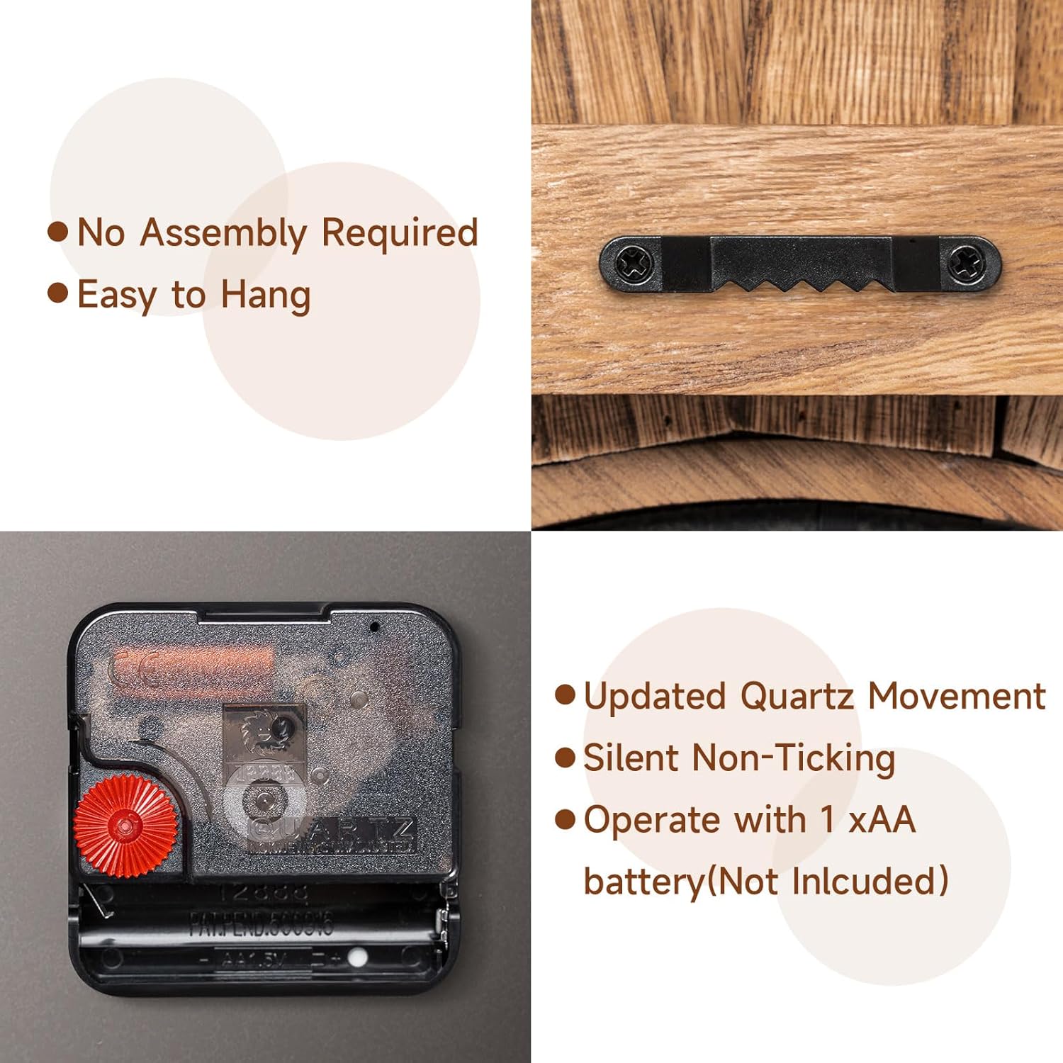 - Special Feature : Silent Clock, natural solid wood & no need assembly, wall decor