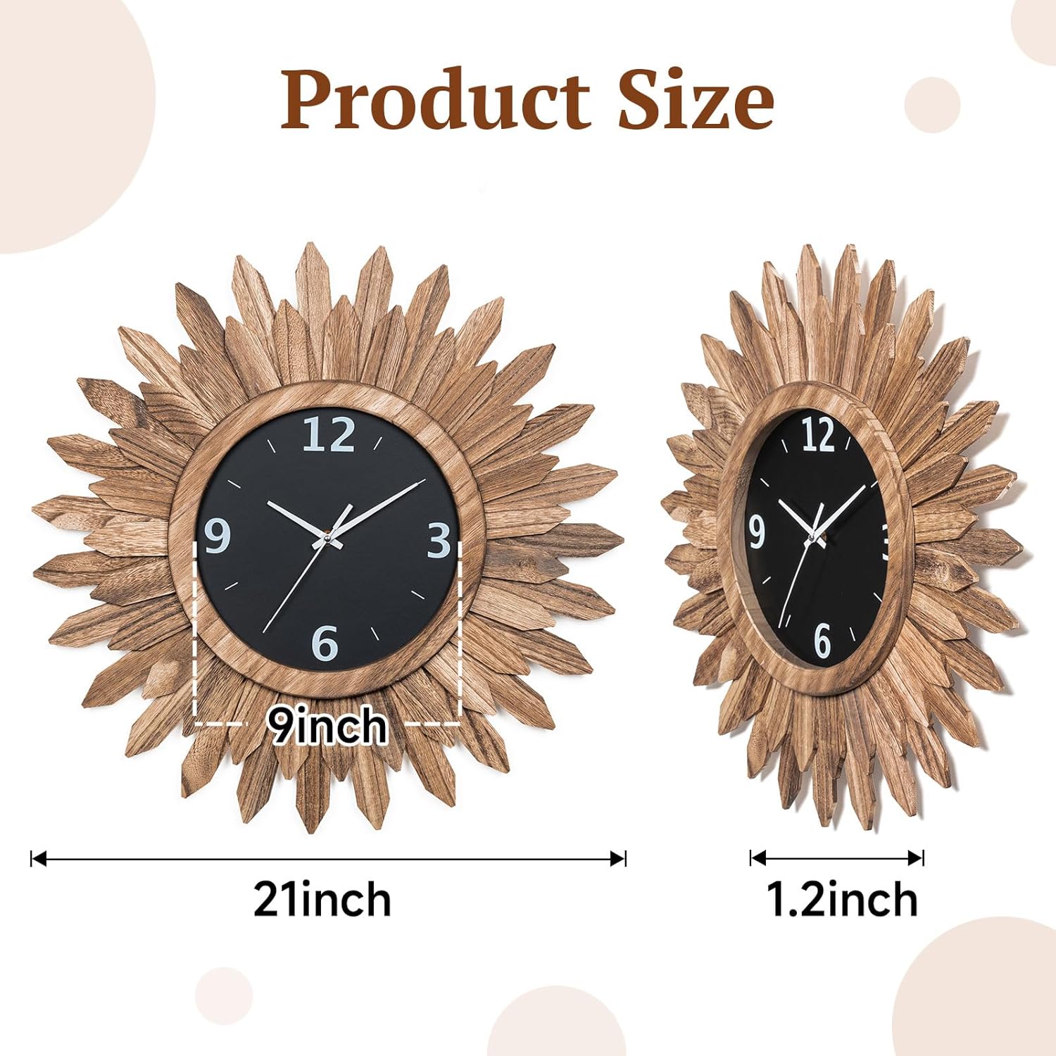 - Boho Wall Decor Clock: Inspired by the sunburst of Bohemian style, this modern wall clock face design is unique and eye-catching, 2 tier wood sunburst looks like the "sun". With a black wooden case, white hour, minute and seconds hands and large white arabic numerals, this decorative wall clock is easy to read from a distance