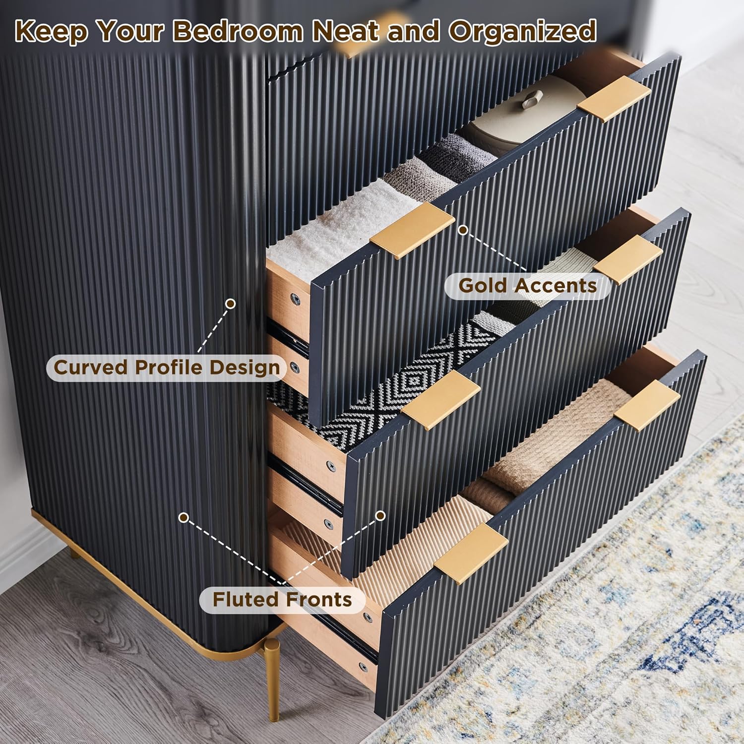 - Elegant Fluted Design: The modern dresser stands out with its fluted fronts on each drawer, adding a touch of sophistication and texture to the overall design. This detail-oriented approach enhances the visual appeal, making it a perfect fit for contemporary and minimalist decors. The fluting not only serves as an aesthetic feature but also subtly hides fingerprints and minor scratches, maintaining the dresser's pristine appearance over time.