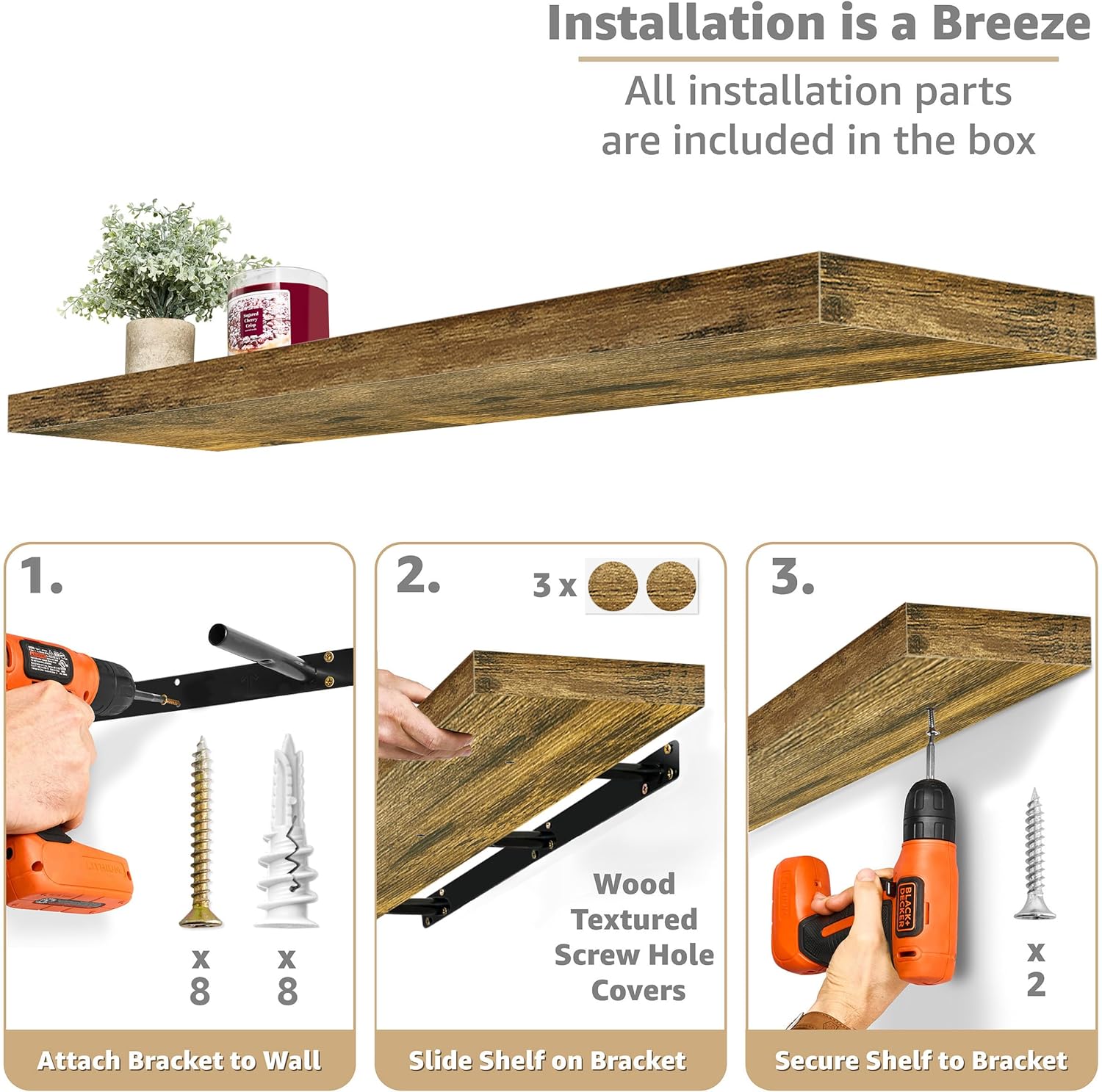 - Decorate & Display: Add character and warmth to any modern or traditional interior. Contrast shelves at staggering heights or mount side-by-side for a clean, streamlined look. Compliments many decor styles