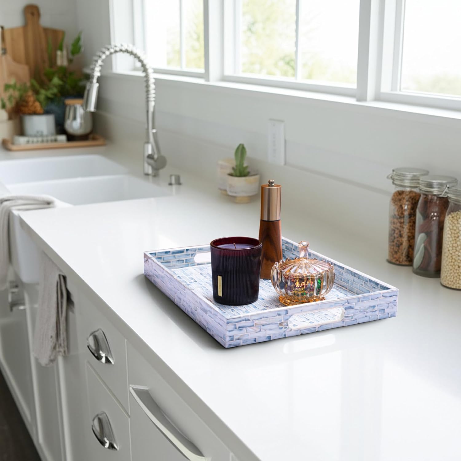 - EASY TO MOVE: With two support handles one on each side, it is easy to place and handle items conveniently in this tray to bring to the table. Surrounding tray lips prevent food from falling over. Making it an attractive piece of home decor or The best Unique House Warming Gifts