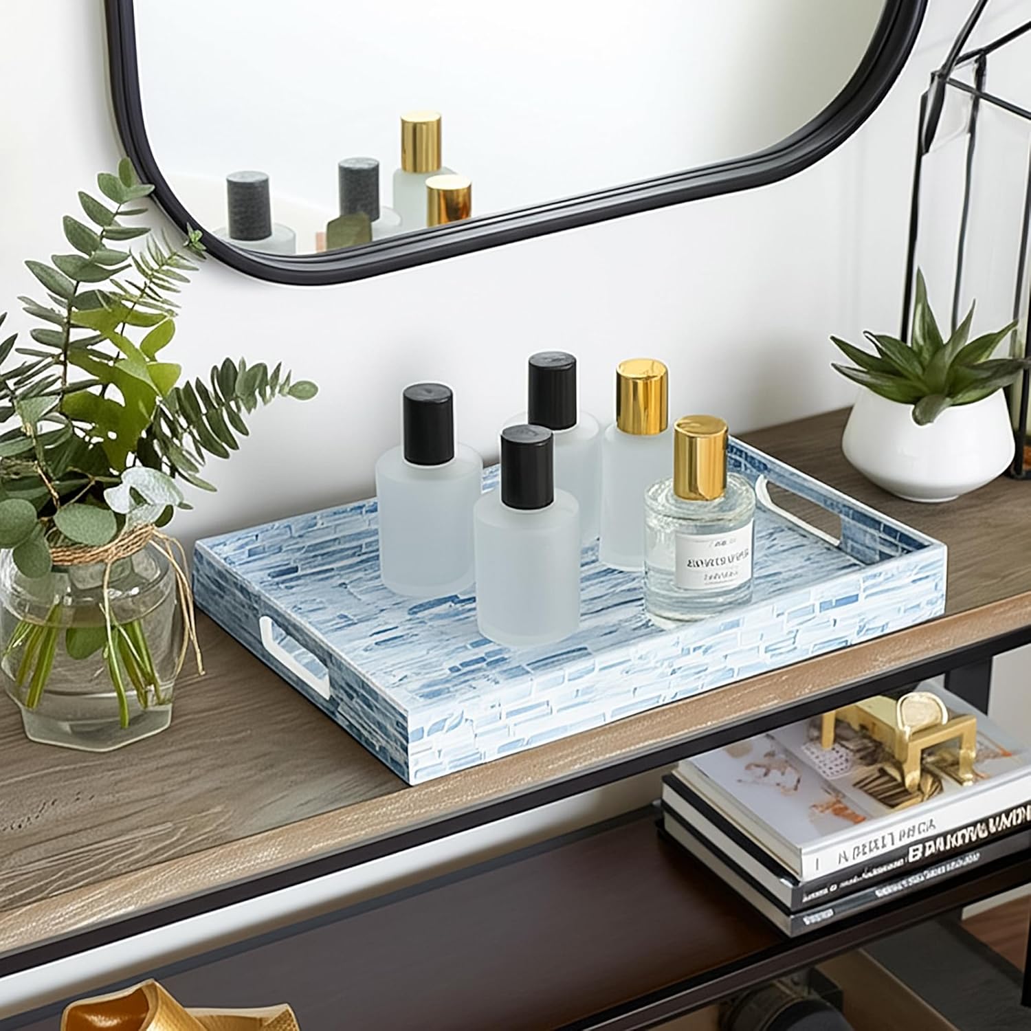 - STYLISH FLORAL TRAYS with the great workmanship by Vietnamese artisans, flawlessly finished with strong wood core and blue floral pattern well-sorted MOTHER OF PEARL SHELLS inlayed on the surface creates an elegant handmade centerpiece to brighten your decoration, best matches any beach/coastal nauticaNew Home Gifts For Homel theme.