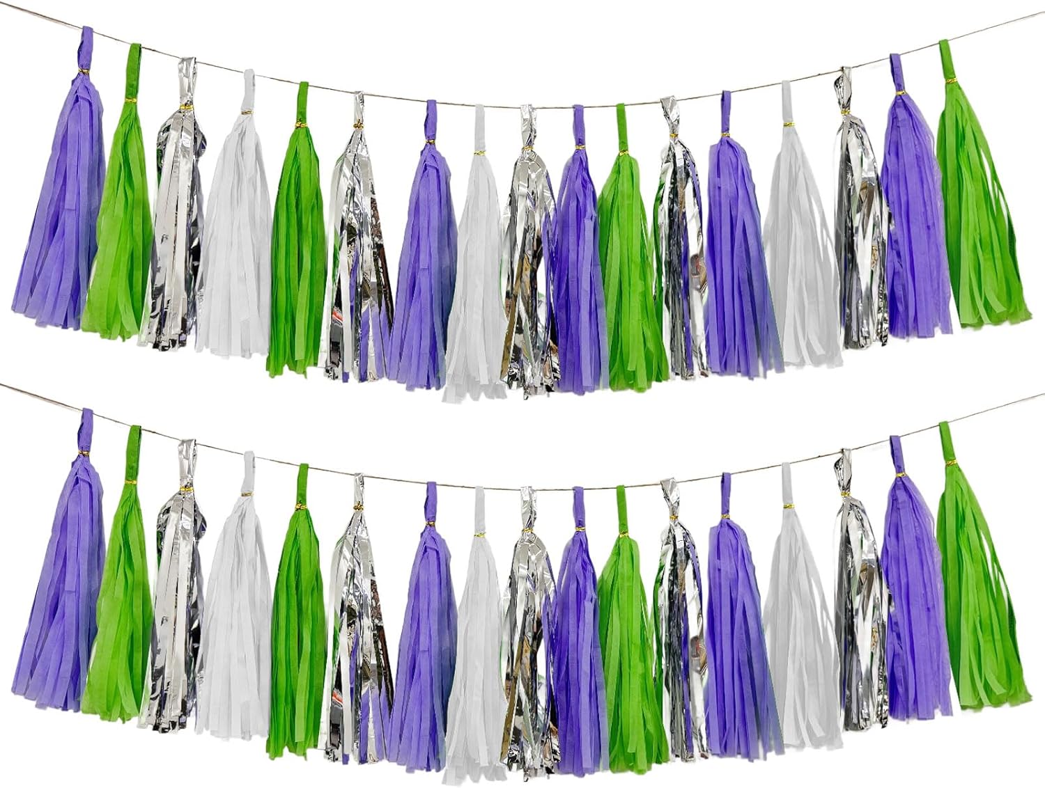 Tissue Paper Tassel Garland Banner, Purple Green Silver White, 20 PCS, Party Decorations for Birthday, Cartoon Themed Baby Shower,Sprot Game,Graduation