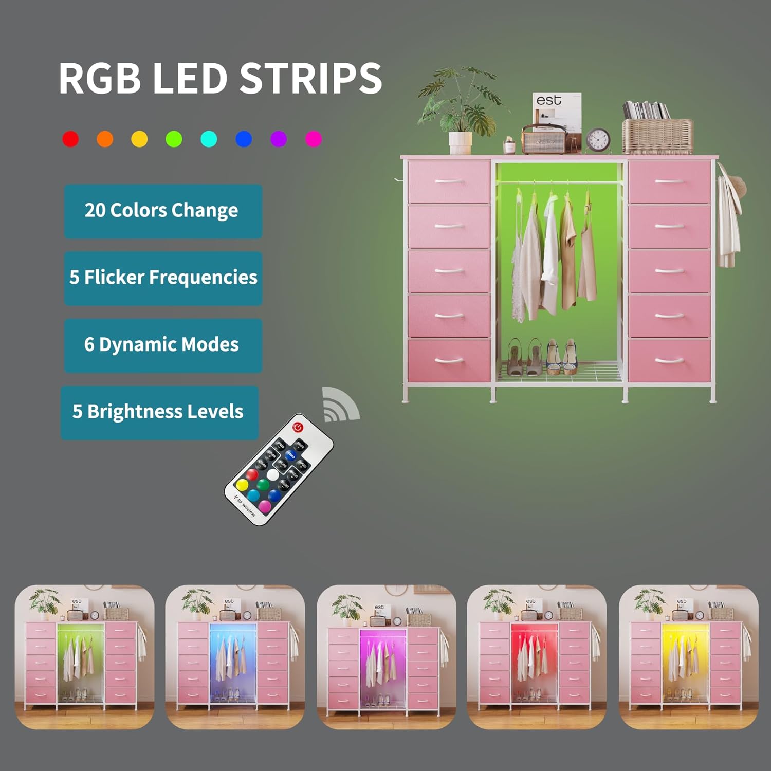 LUMTOK 2-in-1 Dresser with Hanging Rack, 10 Drawers Dresser for Bedroom,Dressers with Fabric Drawers,LED Lights, Charging Station and Hanging Racks for Bedroom (Pink)