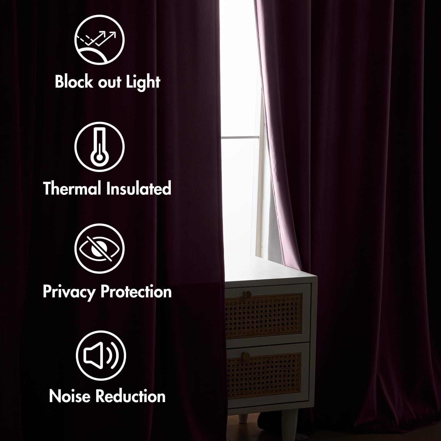 - FUNCTION: Craft from thick velvet, curtains can block 80% of the sunlight. Also, these drapes can keep heat down in summer or keep cold out in winter to achieve smart energy saving. And these panels can provide privacy, reduce noise, which help to create a quiet sleeping environment.