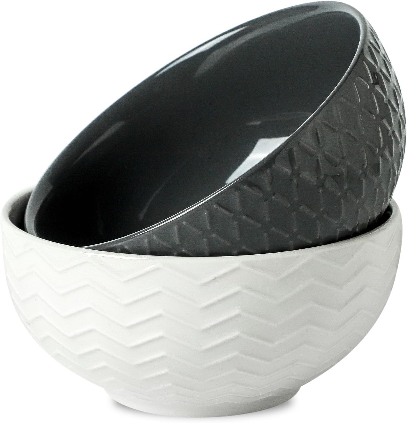 Hasense 26 OZ Soup Bowls, Ceramic Cereal bowls Set of 2 for Kitchen, Embossed Stoneware Porcelain Salad Bowls for Soup, Cereal, Oatmeal, Fruit, Microwave Dishwasher Safe, White And Gray