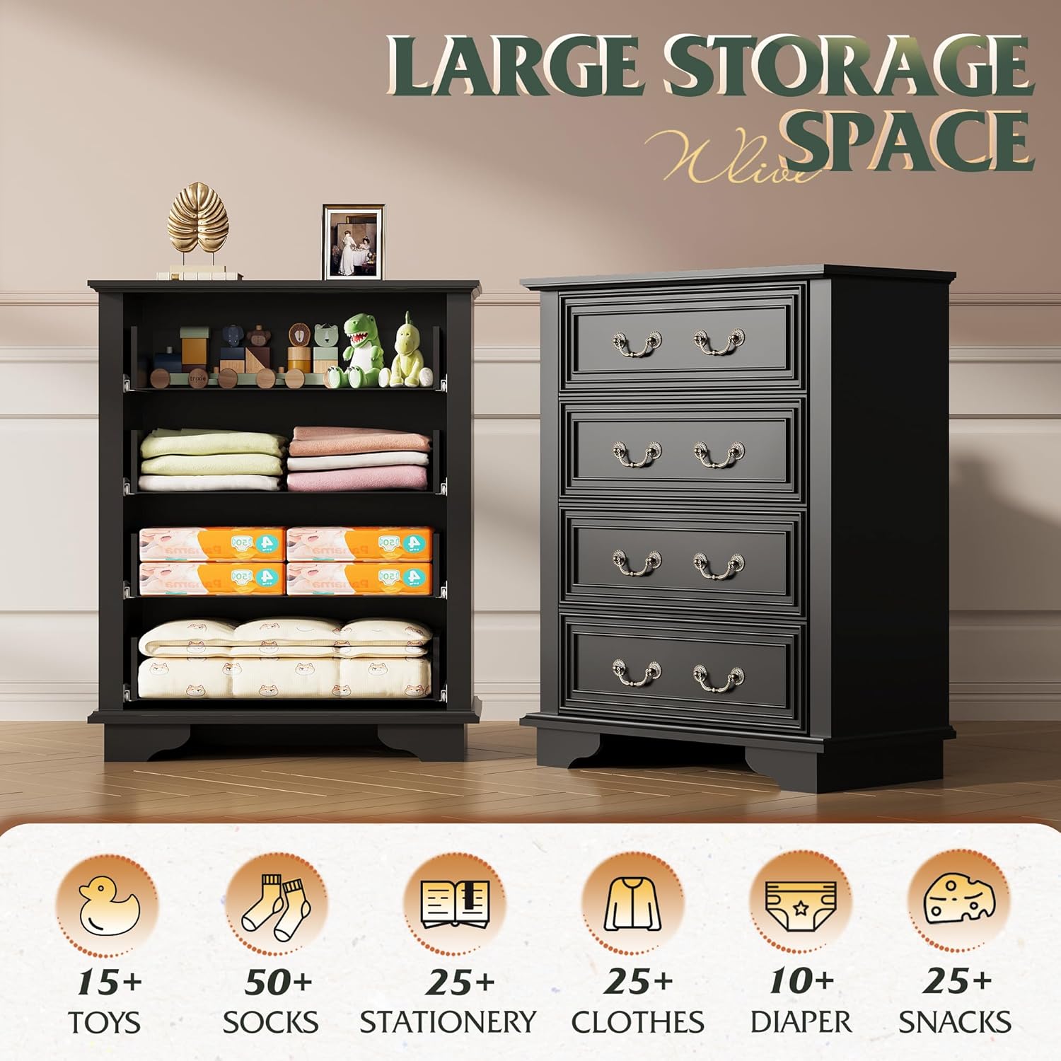 WLIVE Farmhouse Dresser for Bedroom, Tall Wood Dresser with 4 Drawers, Chest of Drawers with Roman Metal Handle for Living Room, Hallway, Closet, Black