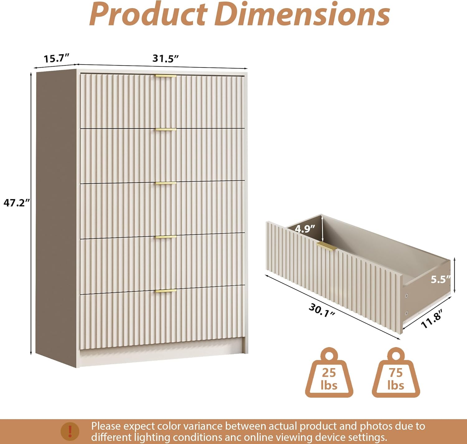 5 Drawer Dresser for Bedroom, Tall Dresser Chest of Drawers with Gold Handles, 32 Inch Wide Nightstand with for Bedroom, Living Rooms, Offices, and Entryways, Beige