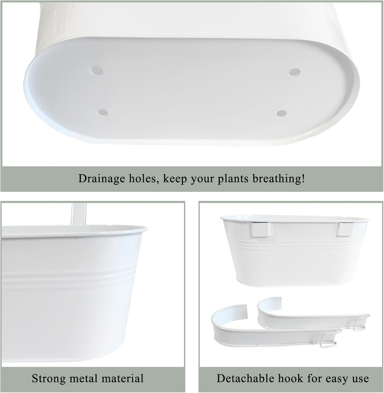 - Detachable Hook & Drainage Hole: The removable hook makes it easy to hang on deck railings, fences, or windows. The drainage hole prevents overwatering, keeping plants healthy. Great for patio planters, herb gardens, or succulents—indoors or outdoors