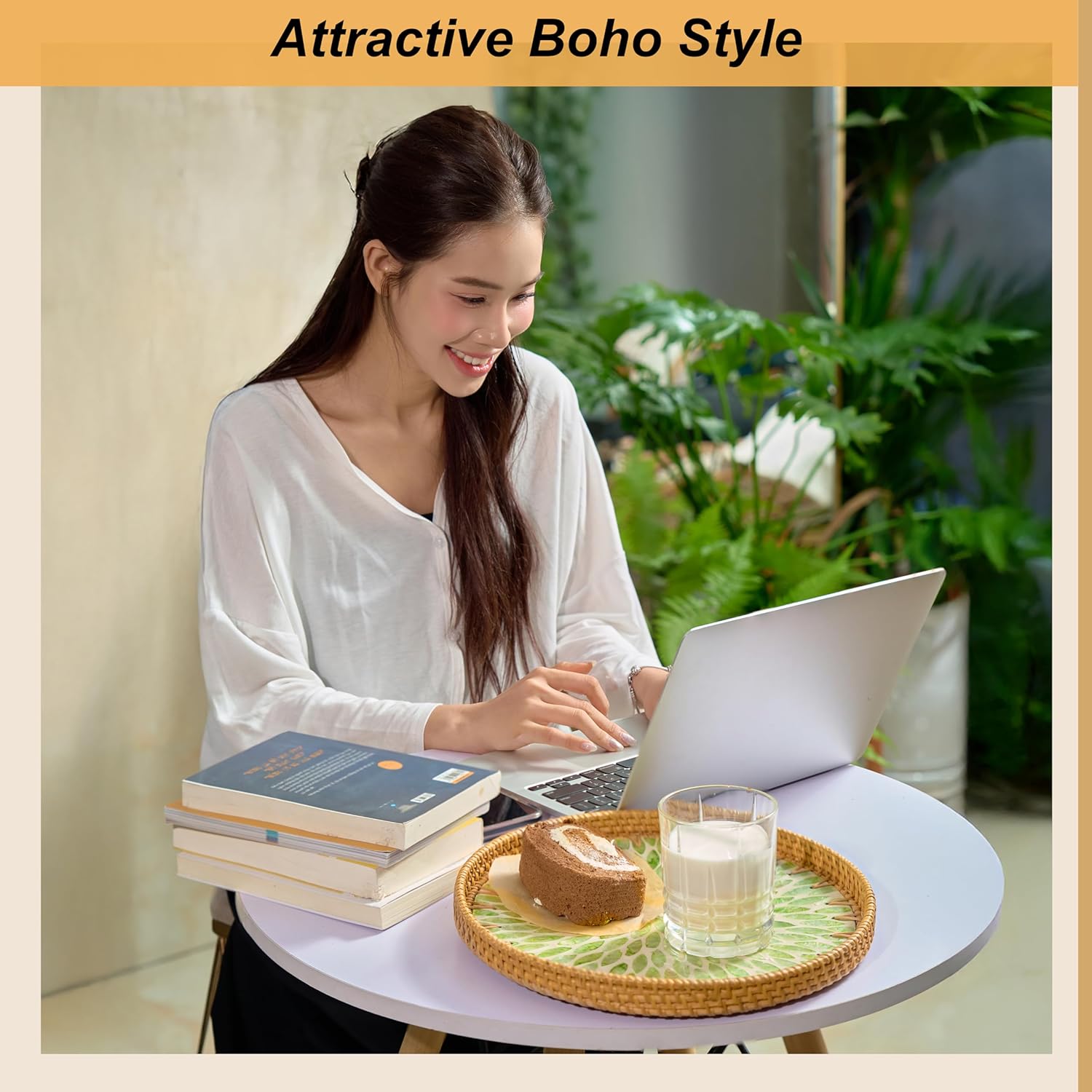 Round 12" Rattan Serving Tray with Mother of Pearl Inlay, Decorative Wicker Tray with Wooden Base for Coffee Table, Bread, Fruit, Food Display and Storage (Leaf)