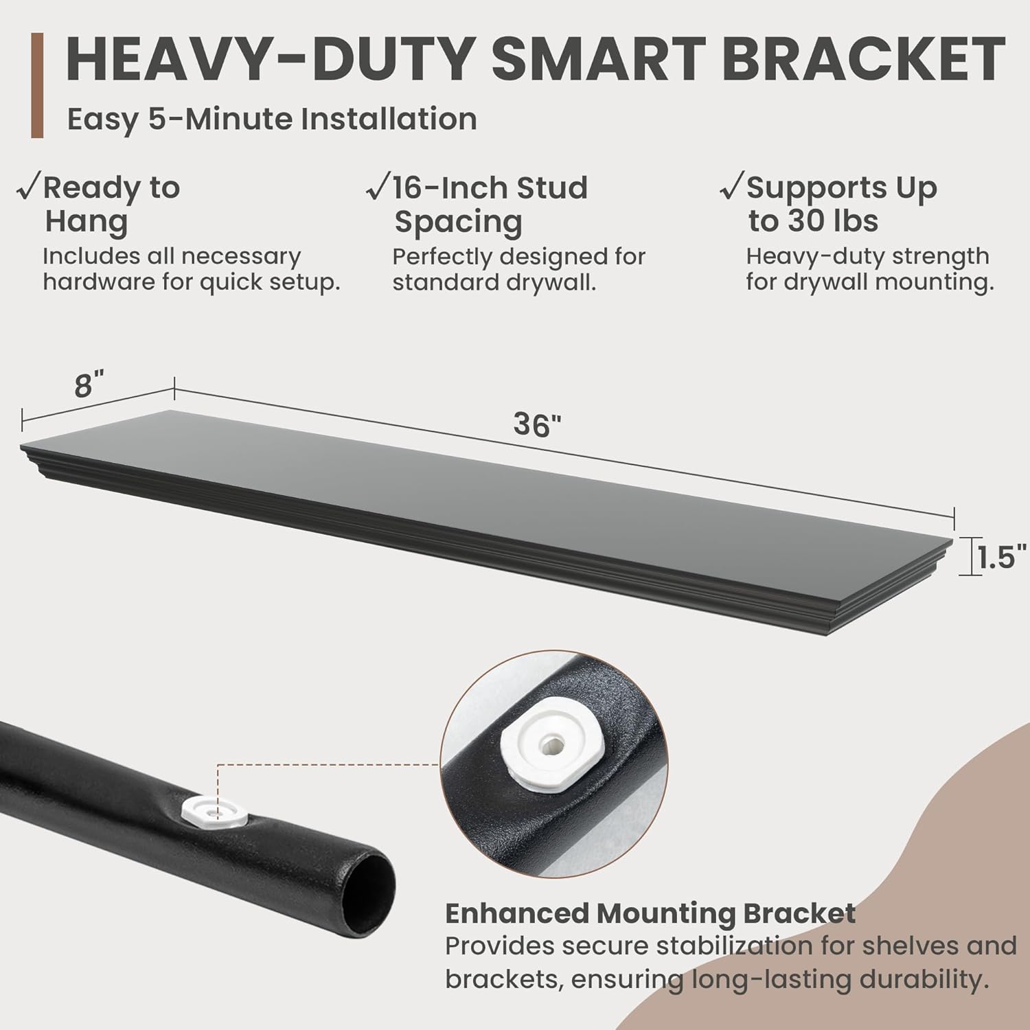 - Package Contents: 1 black floating shelf included, board dimension: 35.5" W x 7.9" D x 1.5" H. Other accessories: 1 metal brackets, 1 magnetic level, 3 wood iron connection screws, 8 wall screws and expansion tubes, and 1 installation manual