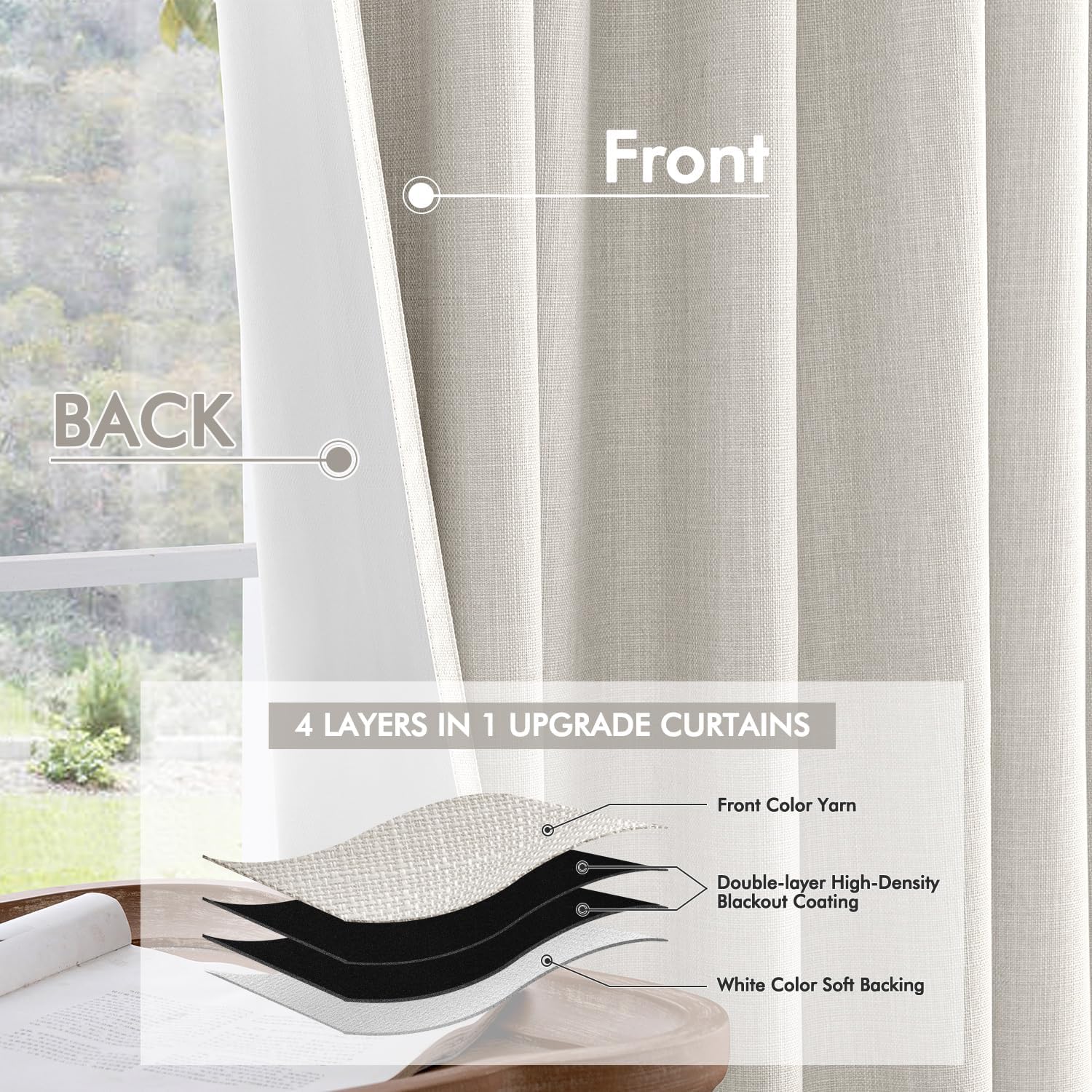 - INNOVATED MATERIAL: Crafted from premium thick linen-like fabric with a substantial weight of 350 GSM, these curtains surpass standard blackout options in thickness, luxurious texture, and functionality. The advanced four-layer coating ensures 100% light blocking, insulation against heat and cold, and effective noise reduction. The vintage burlap texture adds timeless charm and highlights their high-quality feel. Energy-efficient and durable, they provide privacy and a cozy atmosphere year-round