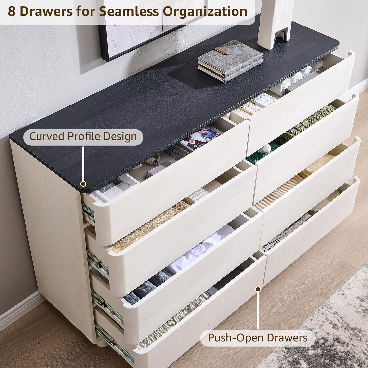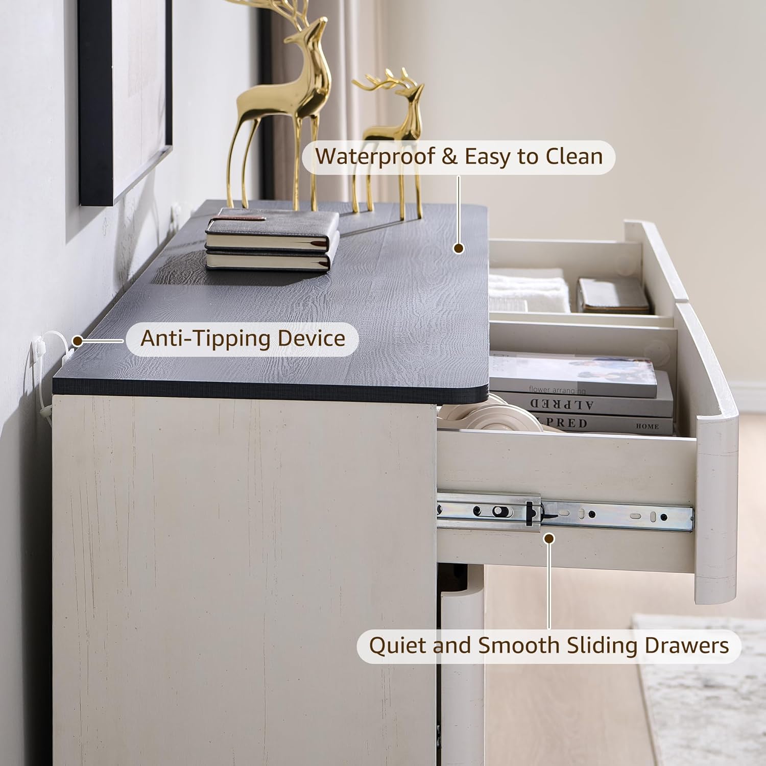 - Handle-Free Design – Clean and modern design,features Push-to-Open drawers for easy and convenient operation.High-quality metal glides ensure quiet and smooth drawer operation. Handle-free convenience—perfect for maintaining a clean, streamlined space.While the rounded edges ensure safety for kids and families.