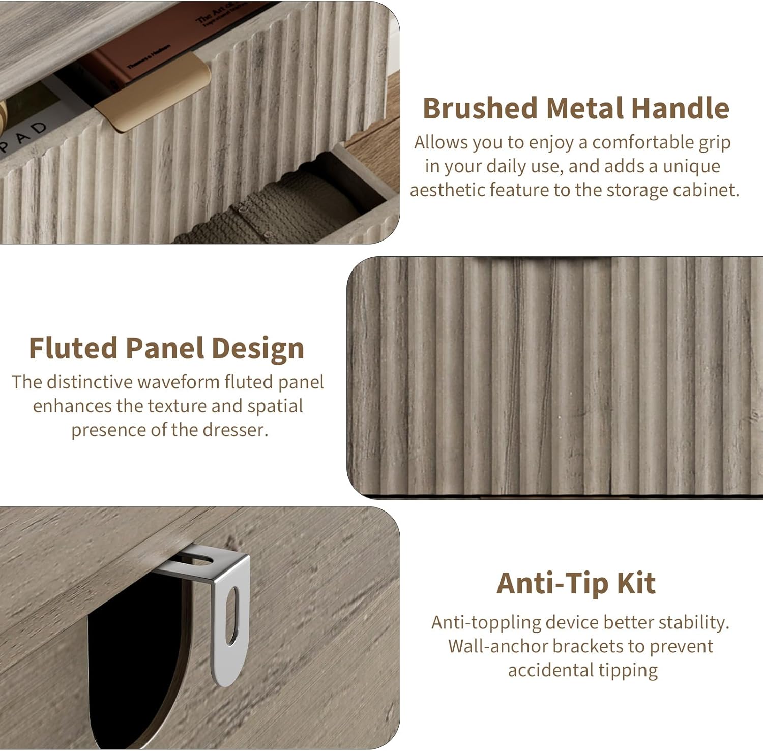 - Modern Chic Appearance: The unique wave-like fluted panel enhances the texture and elegance of this bedroom dresser. The thick table top features natural wood grain that complements the natural oak finish. The wide metal handle and splayed base legs add a modern touch, creating a personalized and distinctive appearance