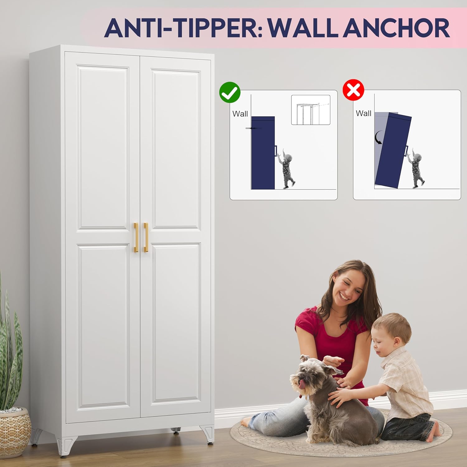 - Safe Anti Tipping Design: The back panel of the food pantry cabinet is equipped with 2 holes, you can use screws to fix the metal storage cabinet to the wall, unlike other cabinets. No dangerous tipping even if there are curious kids around. Ensure maximum stability and safety