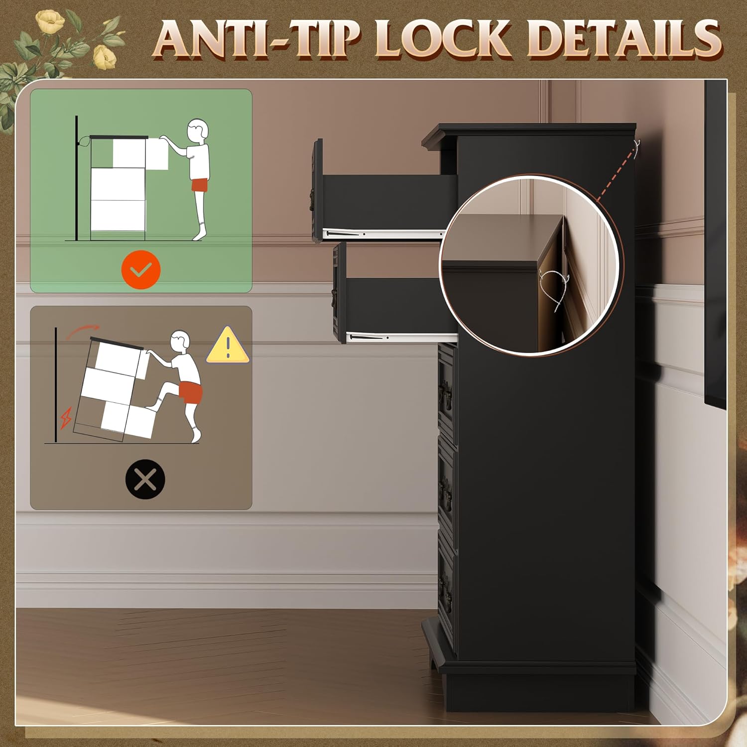 - 【Safe and Sturdy】The dressers & chests of drawers are made of durable engineered wood, featuring a thick tabletop that can support heavy items. Sloping edges and widened legs improve stability. An anti-tipping device ensures child safety by preventing wobbling and tipping.