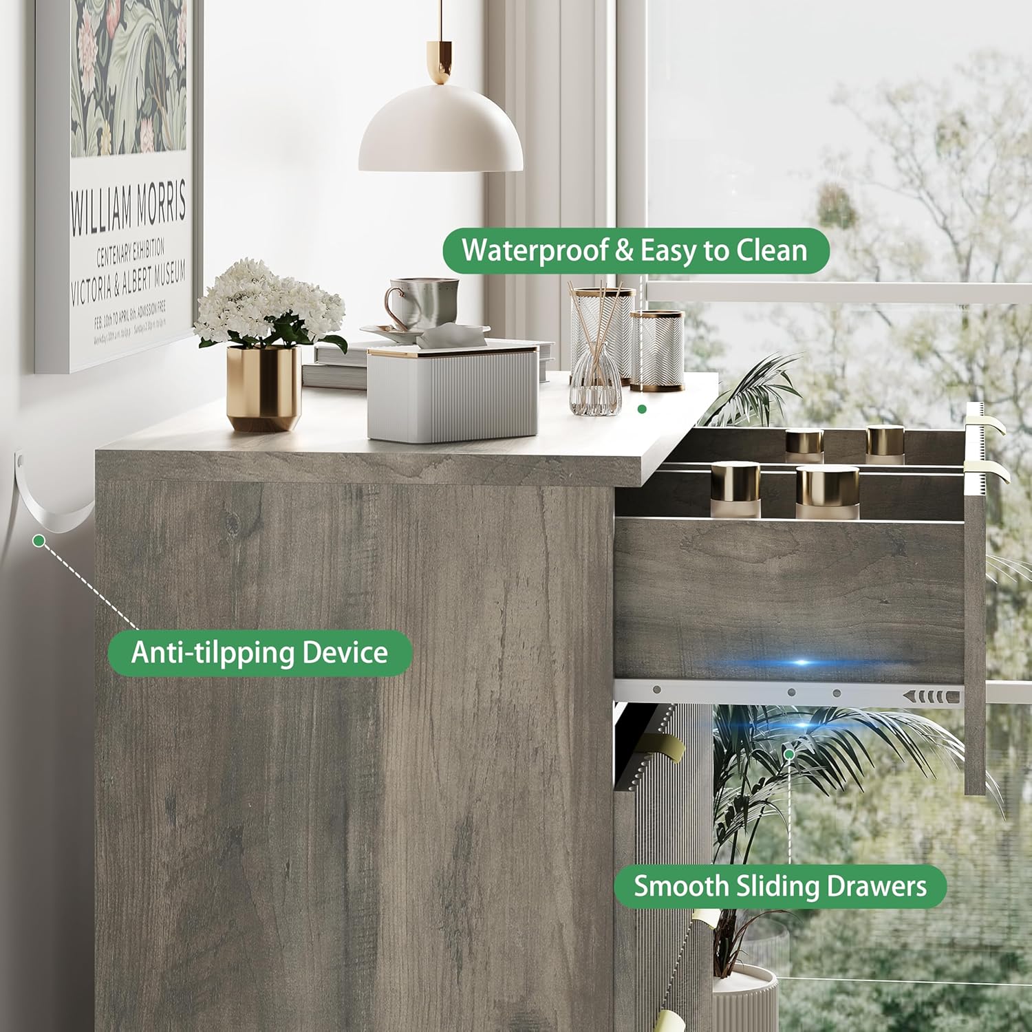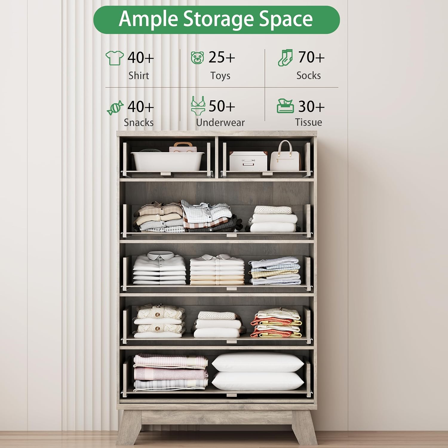 - 【Stability & Safety】The white/black/natural oak/grey dresser is equipped with an anti-tipping device, which can be fixed on the wall to prevent accidents. Each drawer contains a wide metal handle and built-in slide rail, easy to push and pull. Besides, the sturdy base provides this dresser with drawers a strong support and the middle feet can be adjustable to keep balance on uneven floors