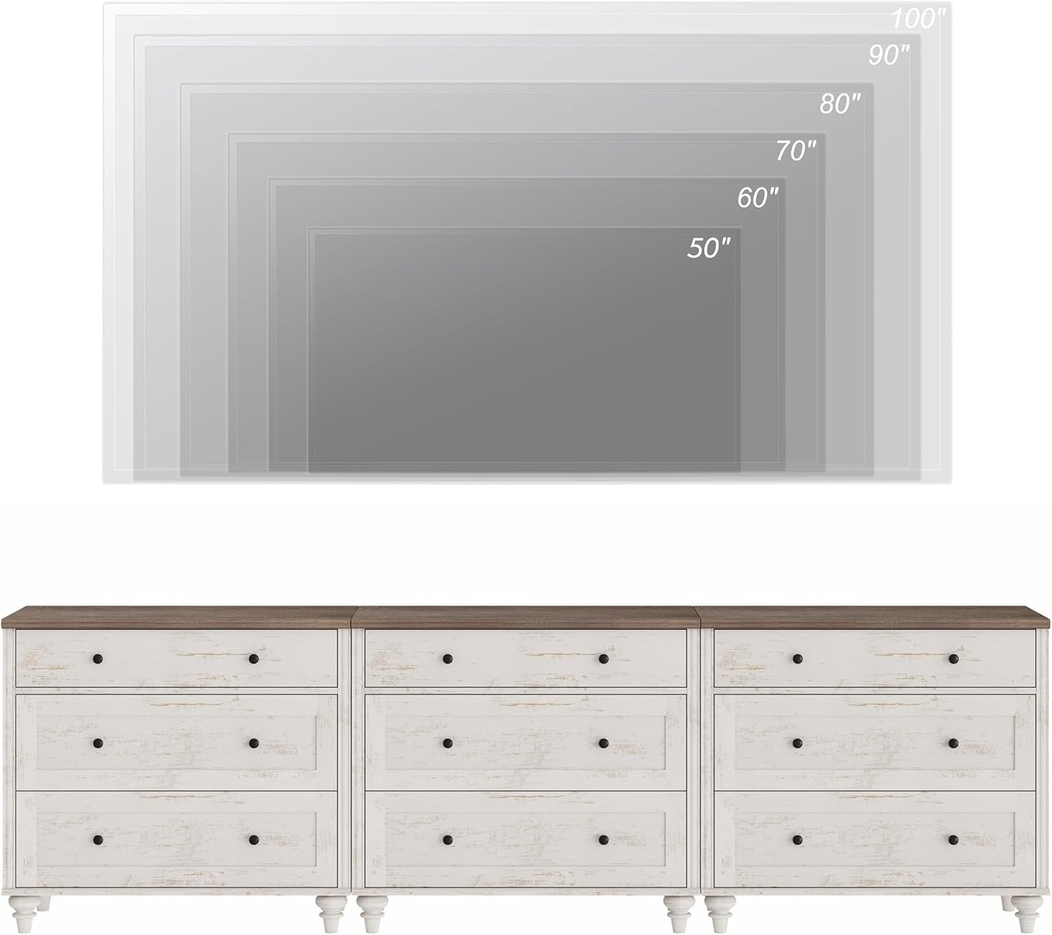- 【Ample Storage Space】Featuring 9 deep drawers, the vintage white dresser is great to organize your clothes, blankets, etc. The dresser for bedroom maximizes the vertical storage space while keeping your daily essentials and display decorations in order.Overall Dimension: 101.6''L×15.7''W×30.9''H